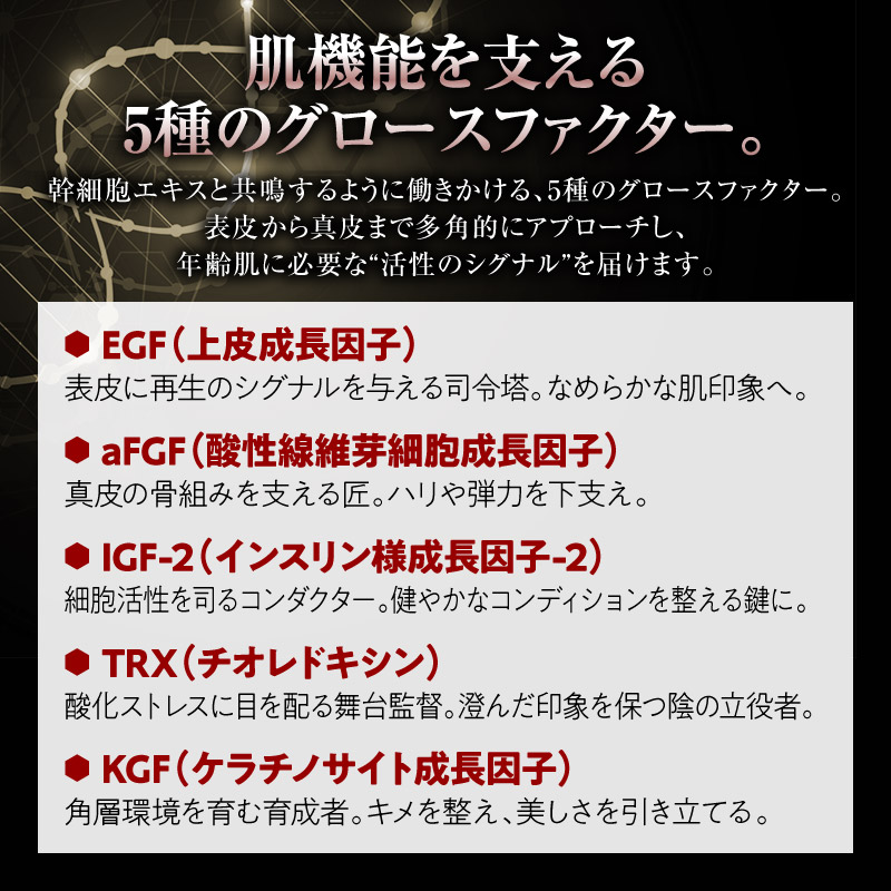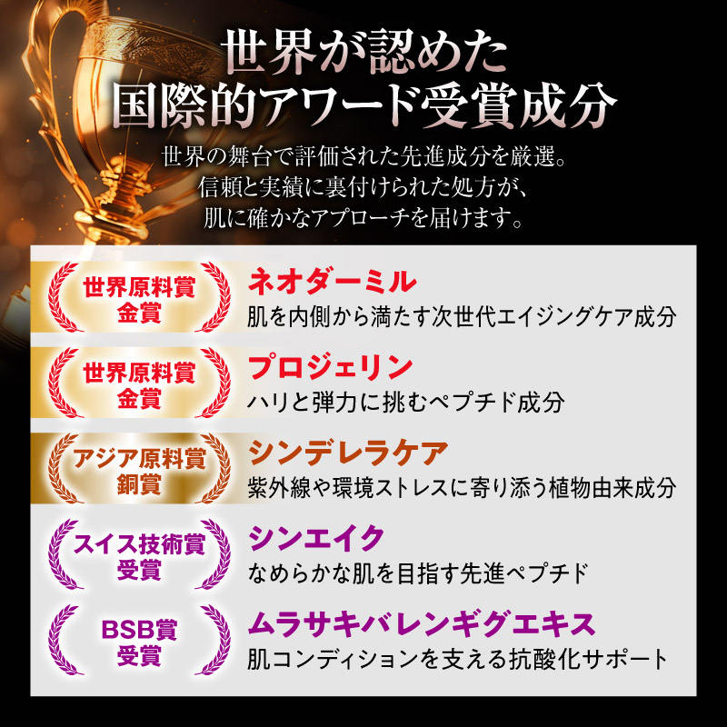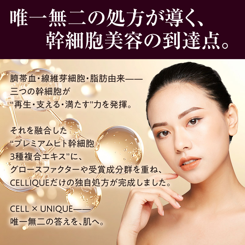 プレミアムヒト幹細胞3種複合エキスが、年齢とともに衰える肌の再生力にアプローチし、内側から押し返すようなハリと弾力を呼び戻します。さらに国際アワード受賞成分5種が、シミやくすみを和らげ、透明感に満ちた明るい印象へ。