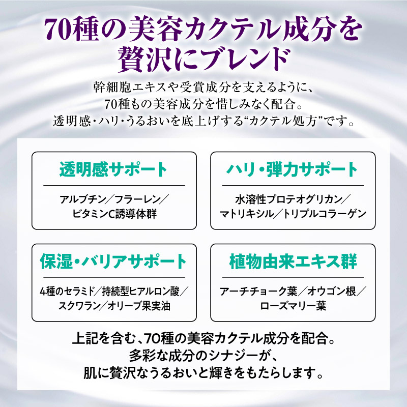 加えて70種の美容カクテル成分が、乾燥⼩ジワやたるみにも多⾓的に働きかけ、潤い・ツヤ・キメを徹底サポート。