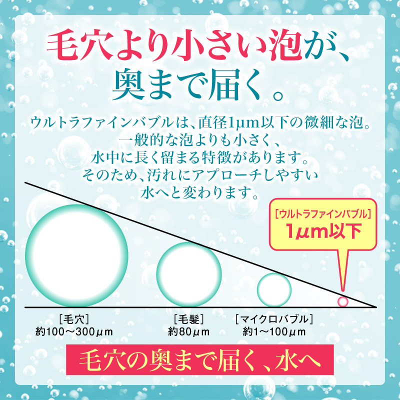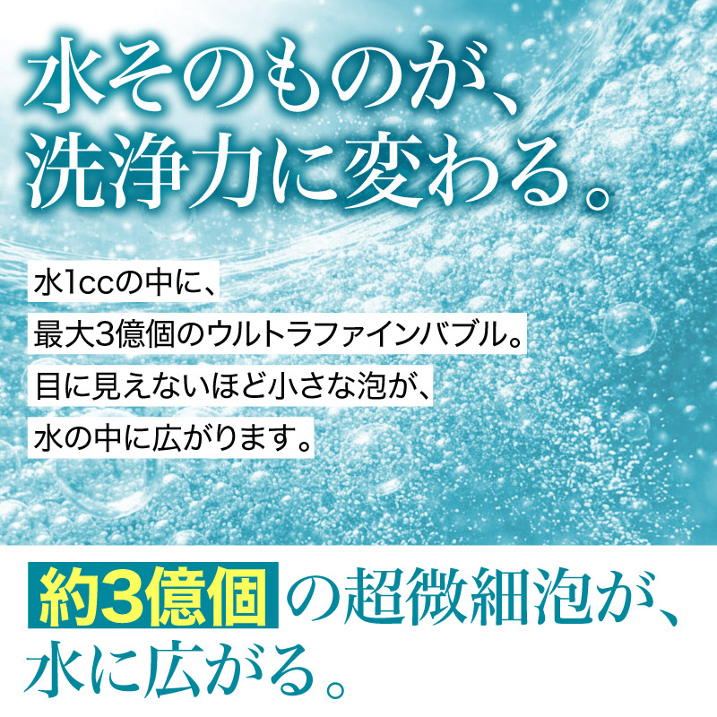 『ウルトラファインバブルブースター』は、⽬に⾒えないほどの⼩さな泡を発⽣させることで、いつもの⽔に新しい価値を⽣み出します。