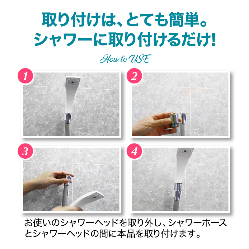 お使いのシャワーヘッドを取り外し、シャワーホースとシャワーヘッドの間に本品を取り付けます。
