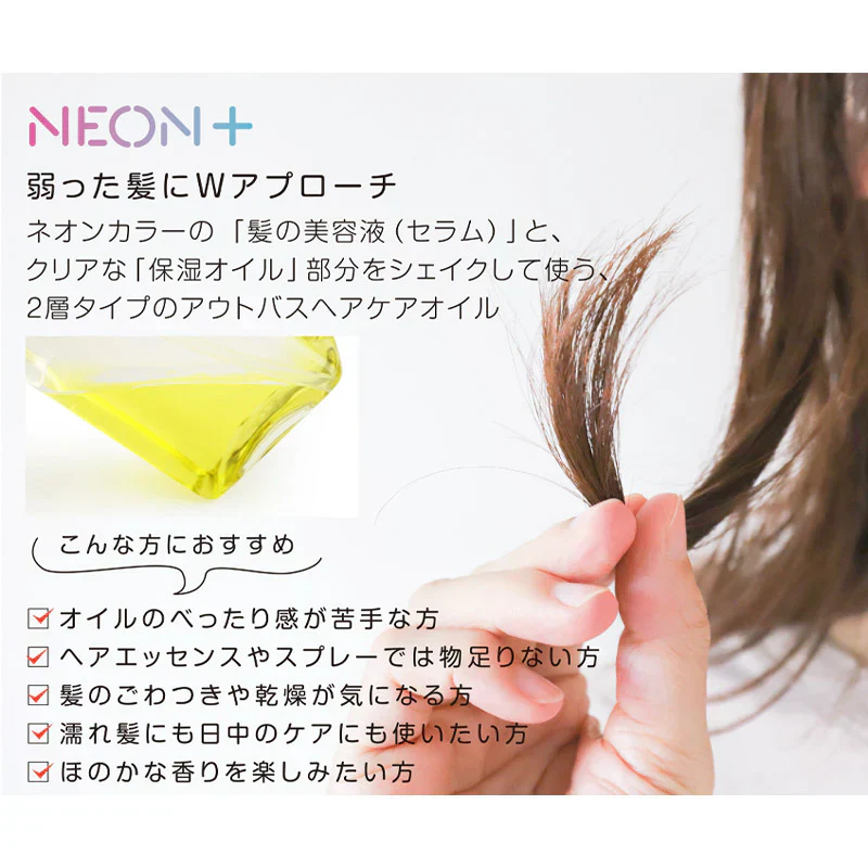 ネオンカラーの「髪の美容液(セラム)」とクリアな「保湿オイル」部分をシェイクして使う、2層タイプのアウトバスヘアケアオイルです♪