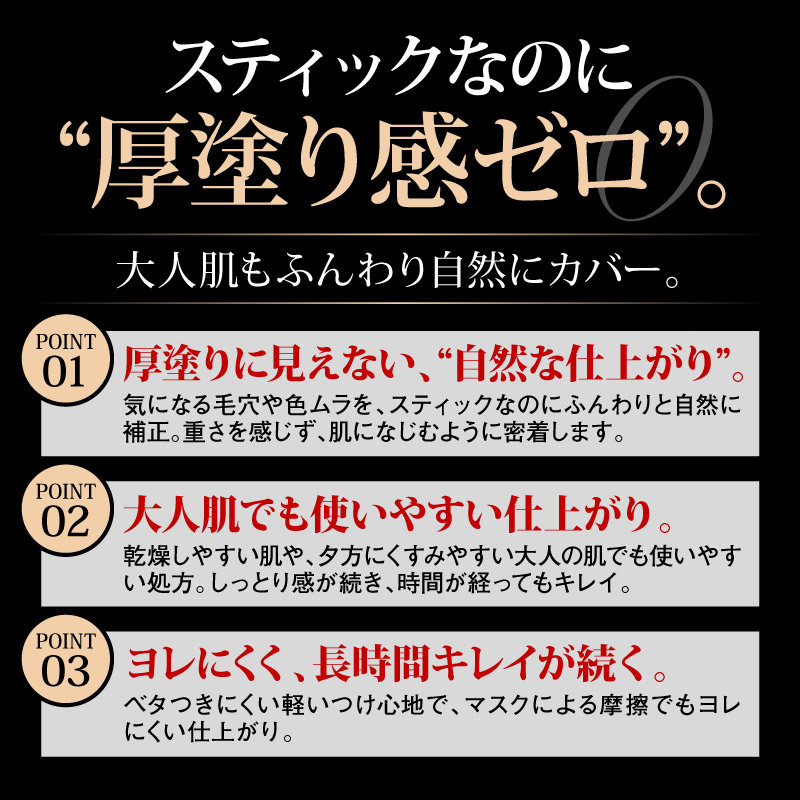スティックタイプなのに、「厚塗り感」ゼロ!大人肌もふんわり自然にカバーします。
